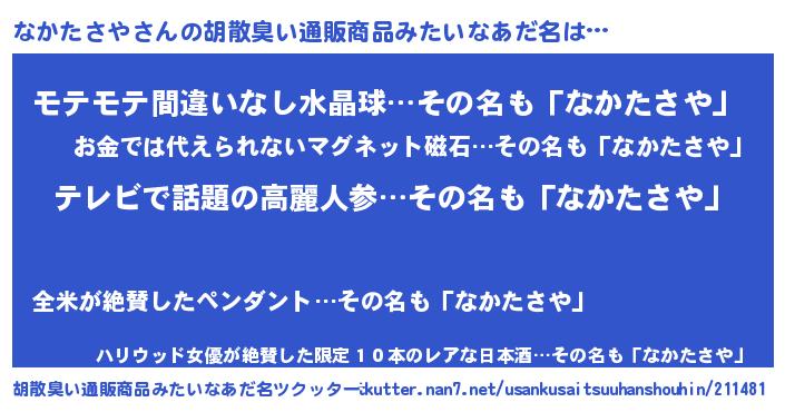 | 意味不明あだ名 | 『自称なかたさや』『ペロリンなかたさや』 |