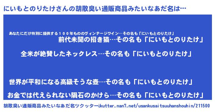| 男性向けラノベタイトル風あだ名 | 『にいもとのりたけの嫁は女の子じゃないと思った?』 |