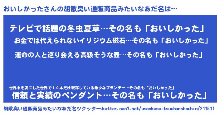 | 男性向けラノベタイトル風あだ名 | 『うちのおいしかったが世界を掌握している!』 |