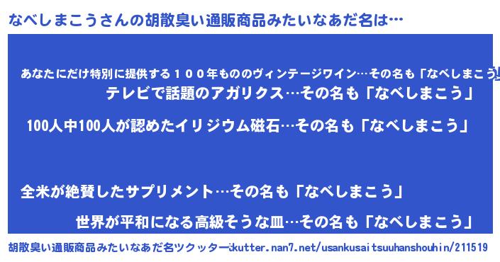 なべしまこうさんの胡散臭い通販商品みたいなあだ名をツクッター!