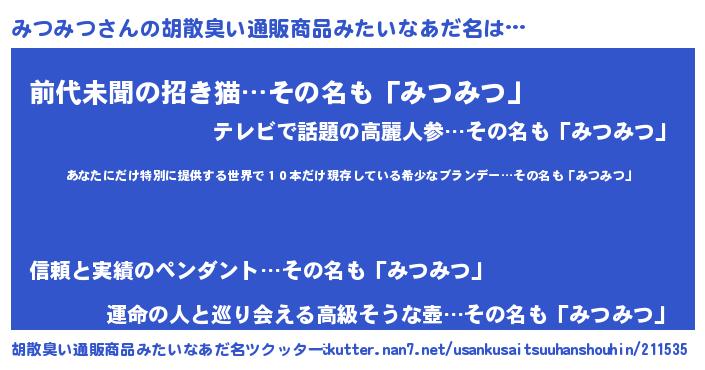 | 意味不明あだ名 | 『住所不定無職みつみつ(93歳)』 |