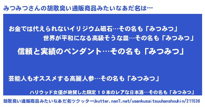 | ヒーロー風カッコイイあだ名 | 『暗黒騎士ミツ』『天空の使者みつみつ』 |