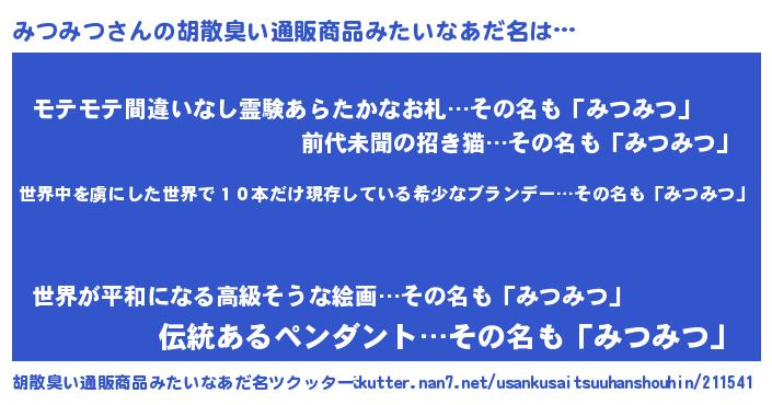 | 女子向けラノベタイトル風あだ名 | 『乙女ゲームの破滅フラグしかない悪役みつみつに転生してしまった…』 |