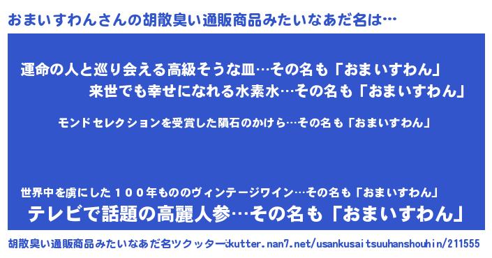 | 意味不明あだ名 | 『ヨモギ科おまいすわん属』 |