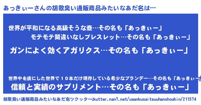 | 意味不明あだ名 | 『自称あっきぃー』『ペロリンあっきぃー』 |