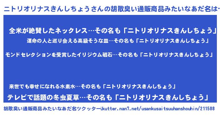 | 伝説のあだ名 | 『救世主となる占い師ニトリオリナスきんしちょう』 |