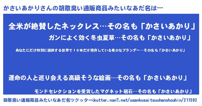 | 意味不明あだ名 | 『住所不定無職かさいあかり(98歳)』 |