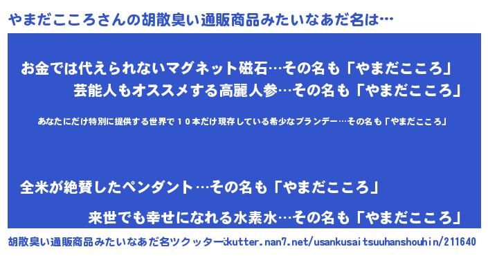 | 意味不明あだ名 | 『住所不定無職やまだこころ(85歳)』 |