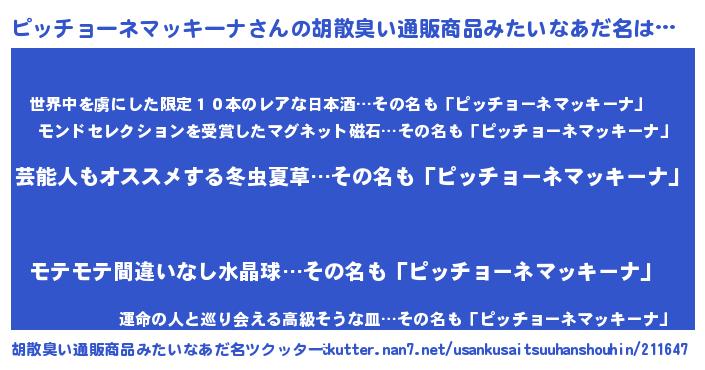 | 男性向けラノベタイトル風あだ名 | 『Re:ピッチョーネマッキーナから始める異世界生活』 |