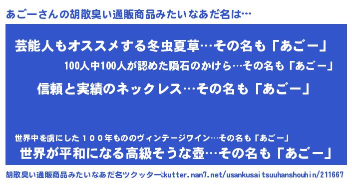 | 意味不明あだ名 | 『とにかく怪しいあごー』『自称あごー』 |