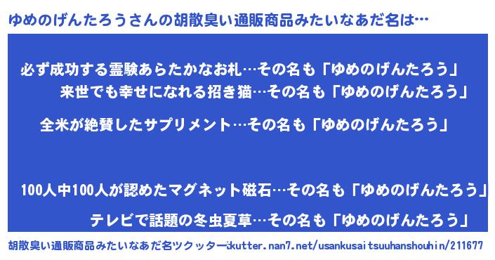 | 女子向けラノベタイトル風あだ名 | 『ゆめのげんたろう様がみてる』 |