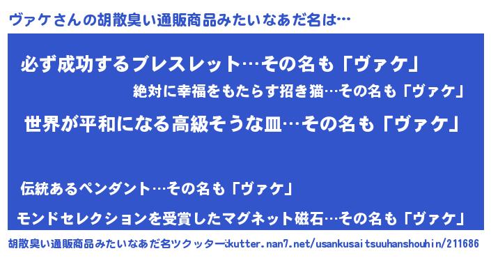 | 女子向けラノベタイトル風あだ名 | 『ヴァケ伯爵の花嫁』『ヴァケの契約王妃』 |