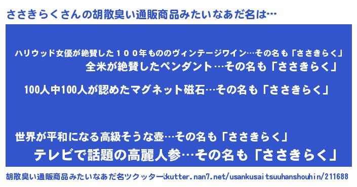 | ヘコむあだ名 | 『ささを』『なまこ酢』『ささにー』 |