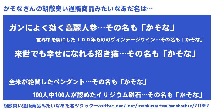 | 意味不明あだ名 | 『永久保存かそな』『自称かそな』 |