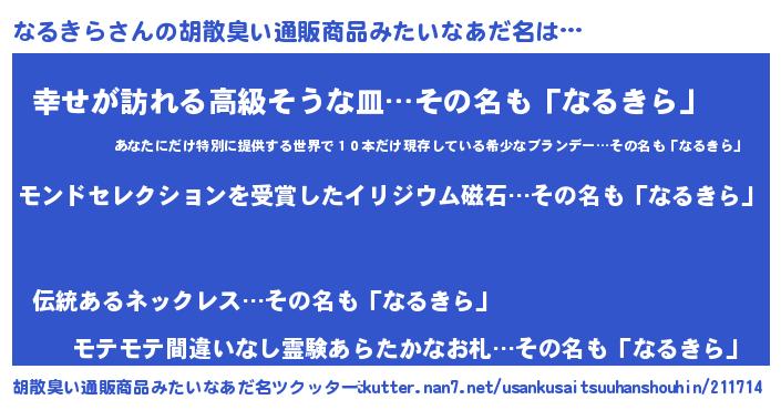| 男性向けラノベタイトル風あだ名 | 『うちのなるきらが世界を掌握している!』 |