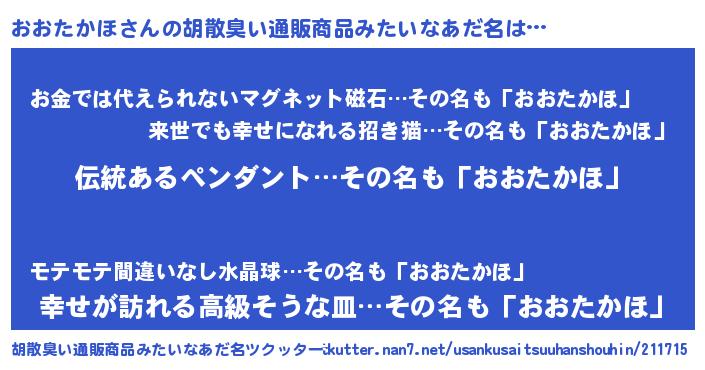 | 意味不明あだ名 | 『とにかく怪しいおおたかほ』 |