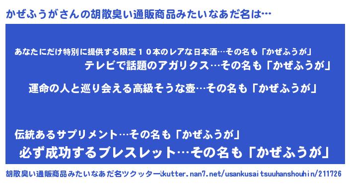 | 男性向けラノベタイトル風あだ名 | 『かぜふうが~年齢イコール彼女いない歴の魔法使い~』 |