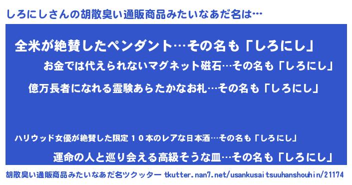 | 男性向けラノベタイトル風あだ名 | 『しろにし~年齢イコール彼女いない歴の魔法使い~』 |