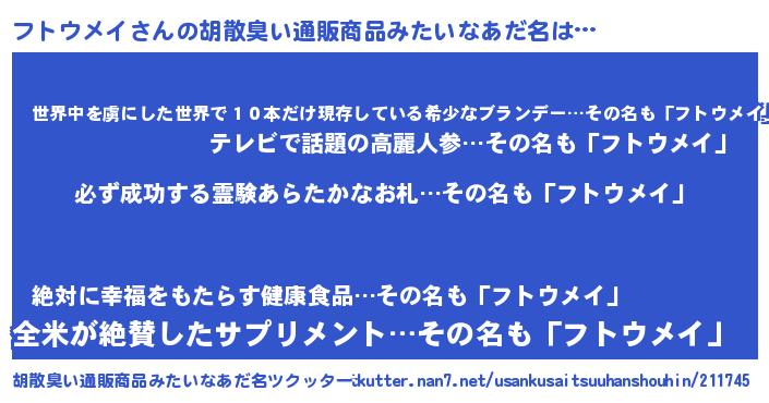| 男性向けラノベタイトル風あだ名 | 『フトウメイの憂鬱』 |