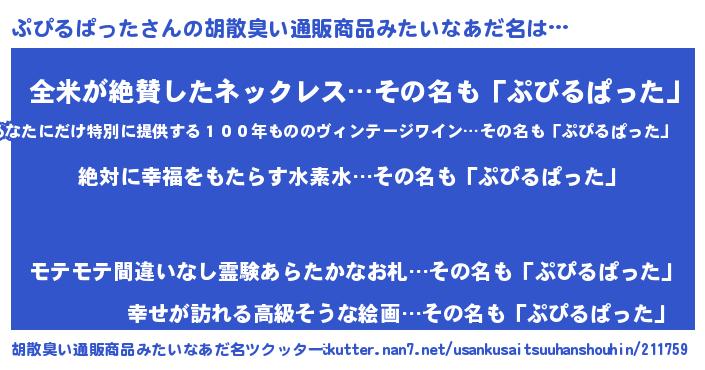 | 男性向けラノベタイトル風あだ名 | 『ぷぴるぱったという概念が存在しない退屈な世界 』 |