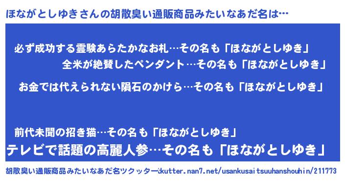 | 男性向けラノベタイトル風あだ名 | 『転生したらほながとしゆきだった件』 |