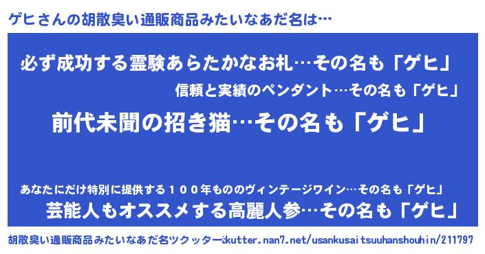 | ヘコむあだ名 | 『ゲヒ(笑)』『ゲヒもー』『ゲヒっぺ』 |