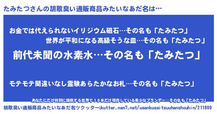 | 男性向けラノベタイトル風あだ名 | 『たみたつ~年齢イコール彼女いない歴の魔法使い~』 |