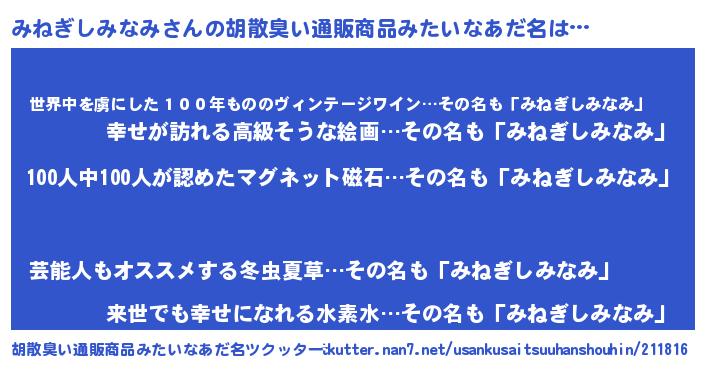 | 意味不明あだ名 | 『眠気覚ましガムみねぎしみなみ味』 |
