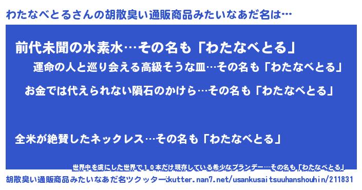 | ヘコむあだ名 | 『わたなべとる(苦笑)』『なまこ酢』 |
