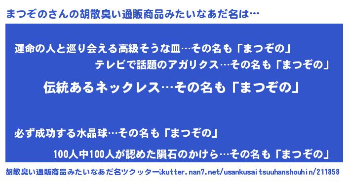 | 男性向けラノベタイトル風あだ名 | 『まつぞのに滅ぼされるだけの簡単なお仕事です』 |