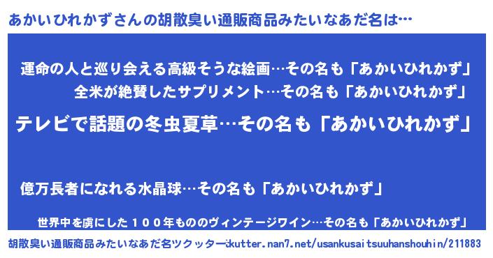 | 男性向けラノベタイトル風あだ名 | 『転生したらあかいひれかずだった件』 |