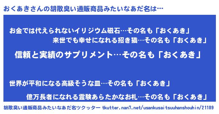 | 欧米人風あだ名 | 『アンジェラ・おくあき』 |