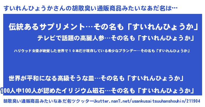| 意味不明あだ名 | 『住所不定無職すいれんひょうか(89歳)』 |