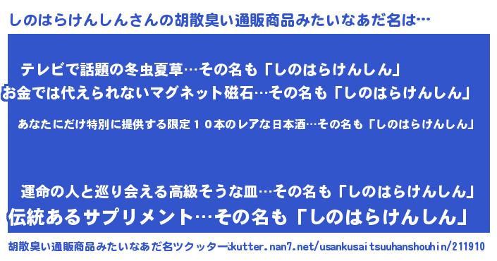 | 意味不明あだ名 | 『住所不定無職しのはらけんしん(14歳)』 |