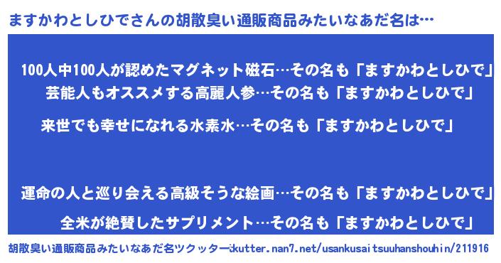 | 男性向けラノベタイトル風あだ名 | 『ますかわとしひでという概念が存在しない退屈な世界 』 |