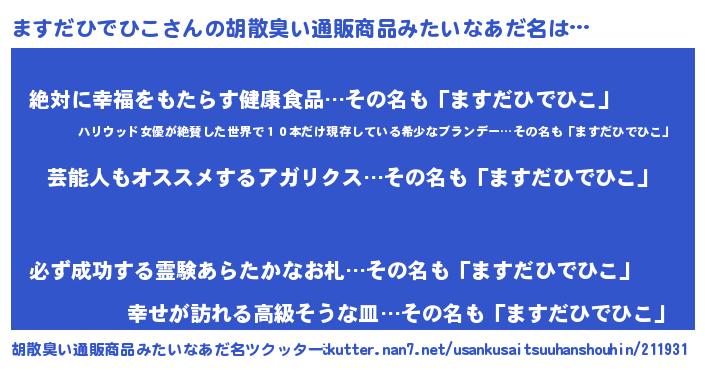 | 男性向けラノベタイトル風あだ名 | 『ますだひでひこ~年齢イコール彼女いない歴の魔法使い~』 |