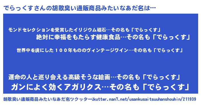 | 意味不明あだ名 | 『住所不定無職でらっくす(13歳)』 |