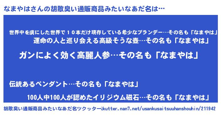 | 男性向けラノベタイトル風あだ名 | 『緋弾のナマヤハ』『ナマヤハスレイヤー』 |