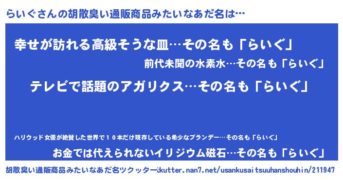 らいぐさんの胡散臭い通販商品みたいなあだ名をツクッター!