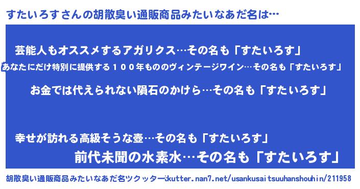 | 男性向けラノベタイトル風あだ名 | 『おまえをオタクにしてやるから、俺をすたいろすにしてくれ! 』 |
