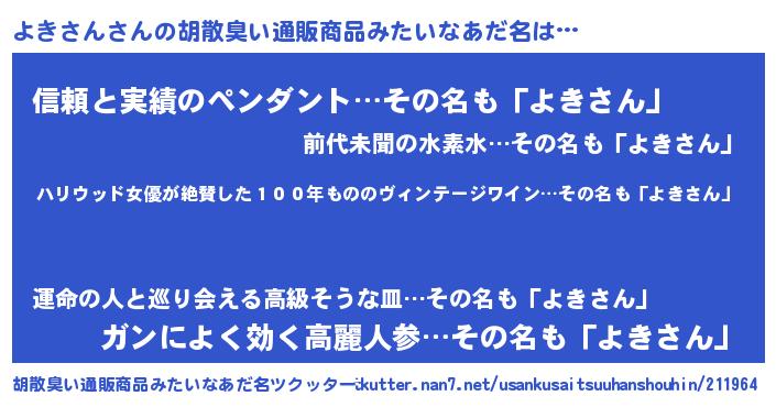 | 意味不明あだ名 | 『住所不定無職よきさん(7歳)』 |