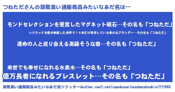 | 男性向けラノベタイトル風あだ名 | 『つねただに滅ぼされるだけの簡単なお仕事です』 |