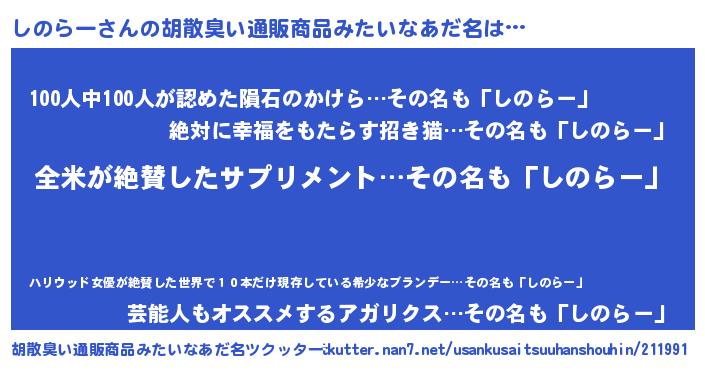 | 意味不明あだ名 | 『とにかく怪しいしのらー』 |