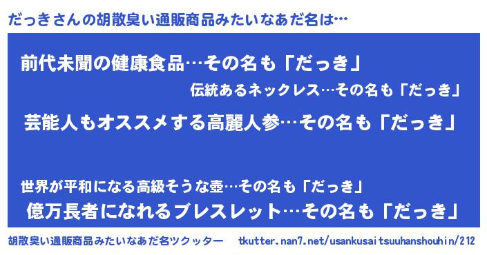 | 意味不明あだ名 | 『自称だっき』『永久保存だっき』 |