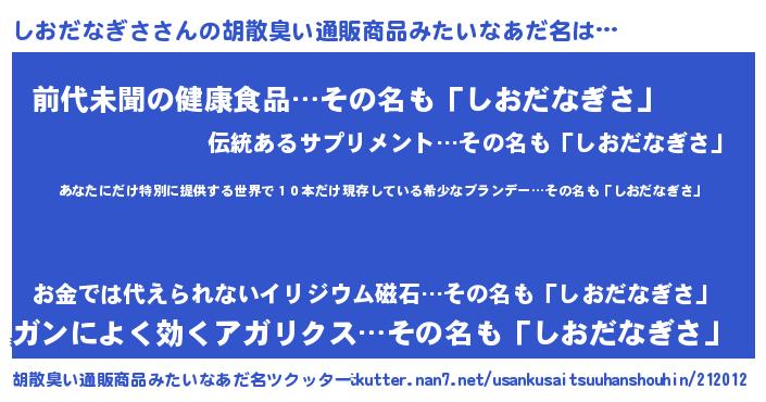 | 意味不明あだ名 | 『住所不定無職しおだなぎさ(98歳)』 |