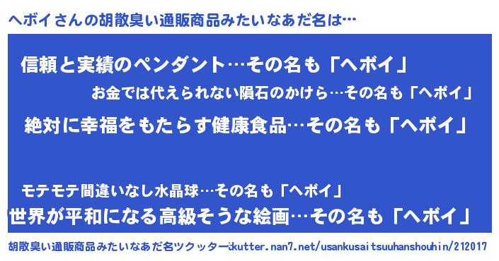 | ヘコむあだ名 | 『ヘボイ(爆)』『ヘボぷりん』『豆乳』 |