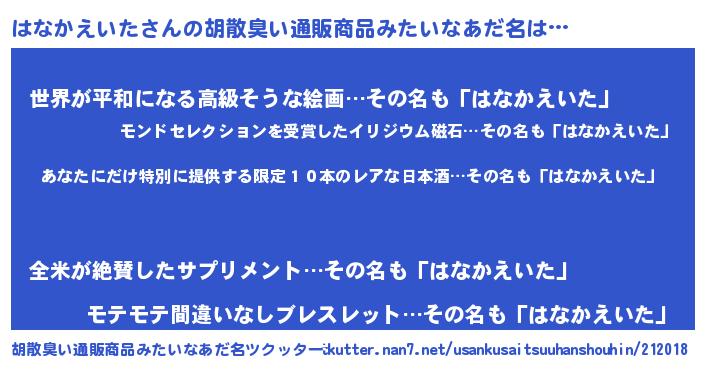 | 意味不明あだ名 | 『住所不定無職はなかえいた(47歳)』 |