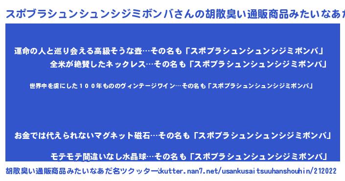 | 男性向けラノベタイトル風あだ名 | 『魔弾の王とスポブラシュンシュンシジミボンバ』 |