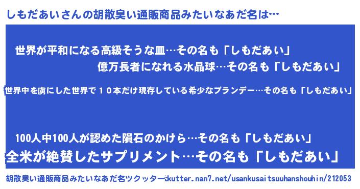 | 意味不明あだ名 | 『住所不定無職しもだあい(91歳)』 |