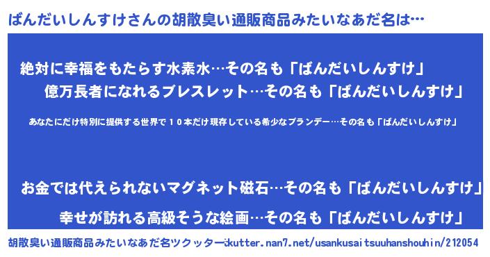 | 男性向けラノベタイトル風あだ名 | 『うちのばんだいしんすけが世界を掌握している!』 |
